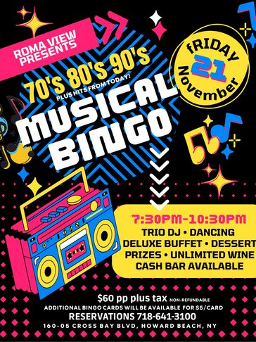 Musical Bingo featuring music from the 70's 80's, 90's and today!